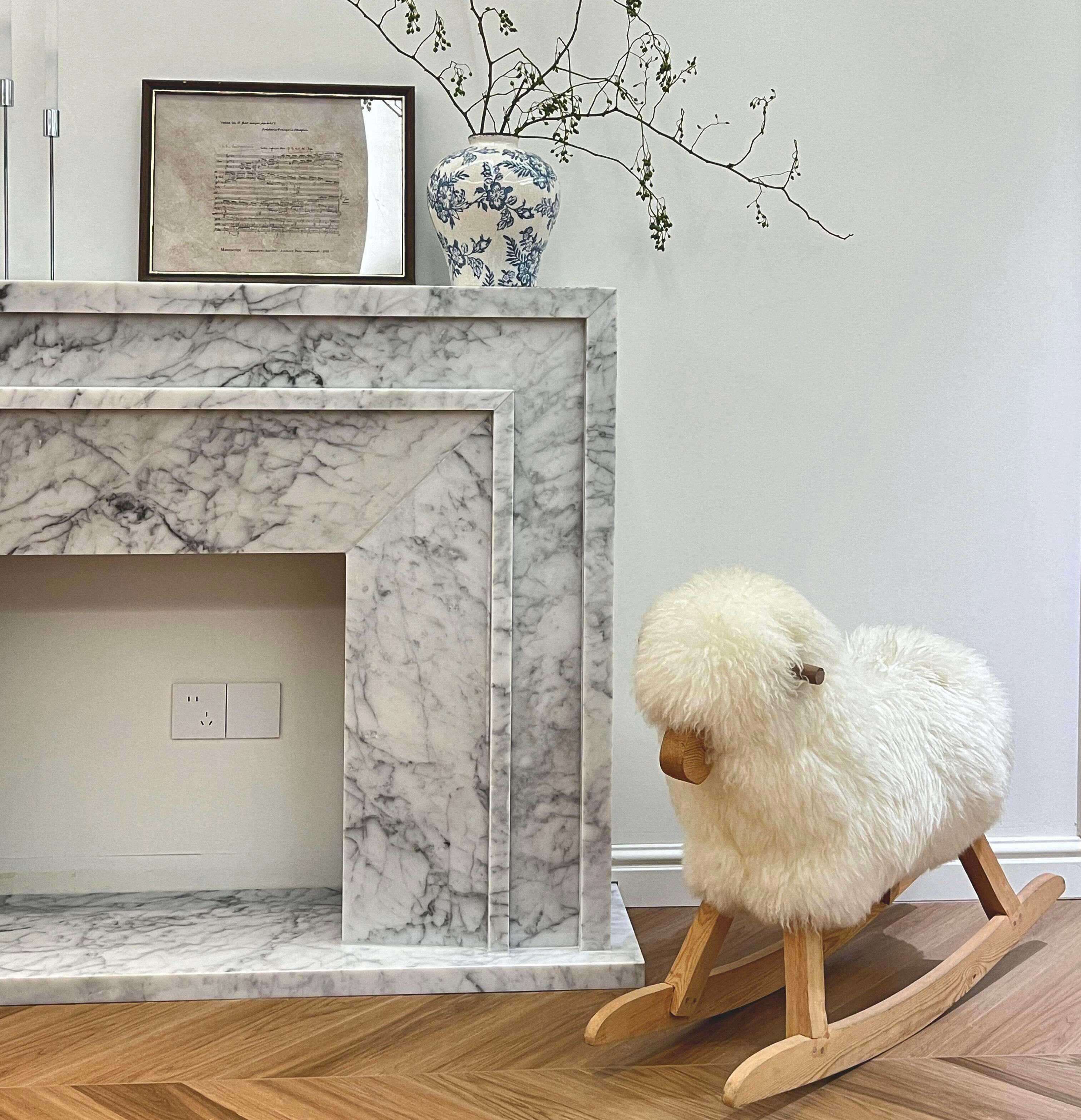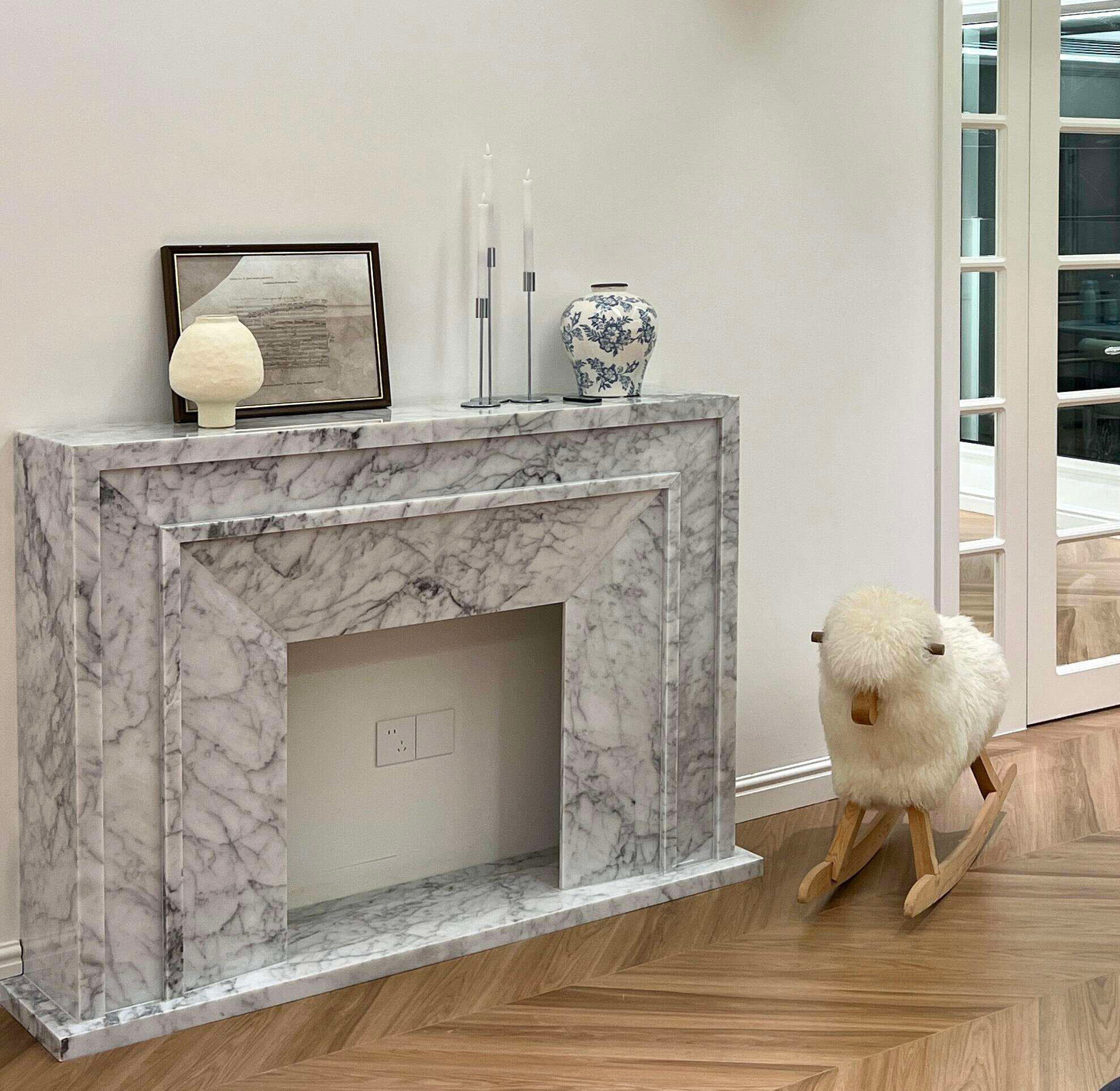 شومینه مرمر کارارا سفید، یک مبلمان سنگی لوکس که از منطقه معدنکاوی کارارا در توسکانی، ایتالیا تأمین میشود، با پسزمینهای از قلههای برفی آلپ و الگوهای نرم و خاکستری-روشن ابریشمی، طراحی شده است. هر تکه از این سنگ، اثری هنری منحصربهفرد از آفرینش طبیعت است. این شومینه با خطوط هندسی مینیمال و ساختار قاب سهبعدی مشخصی طراحی شده که حس پیشرفته مینیمالیسم ایتالیایی را بهطور کامل با فضای ظریف و اشرافی سبک فرانسوی ادغام میکند. این شومینه نهتنها نقطه کانونی بصری فضاست، بلکه قطعهای از هنر خانگی نیز محسوب میشود که گرمای زندگی را منتقل میکند.