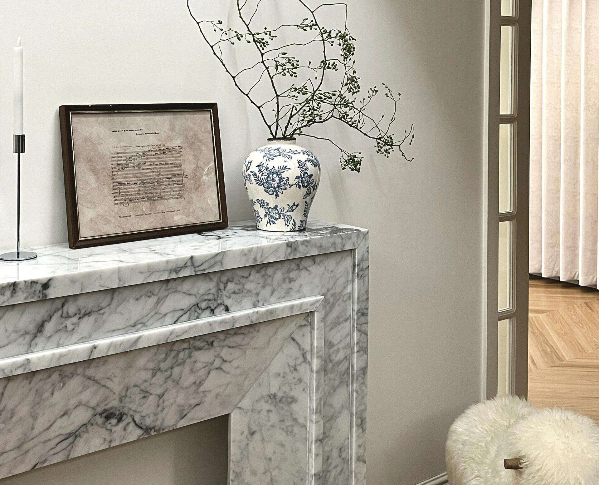 شومینه مرمر سفید کارارا با بافت کلاسیک و اشرافی خود، قابلیت سازگاری با انواع فضاهای لوکس را دارد: