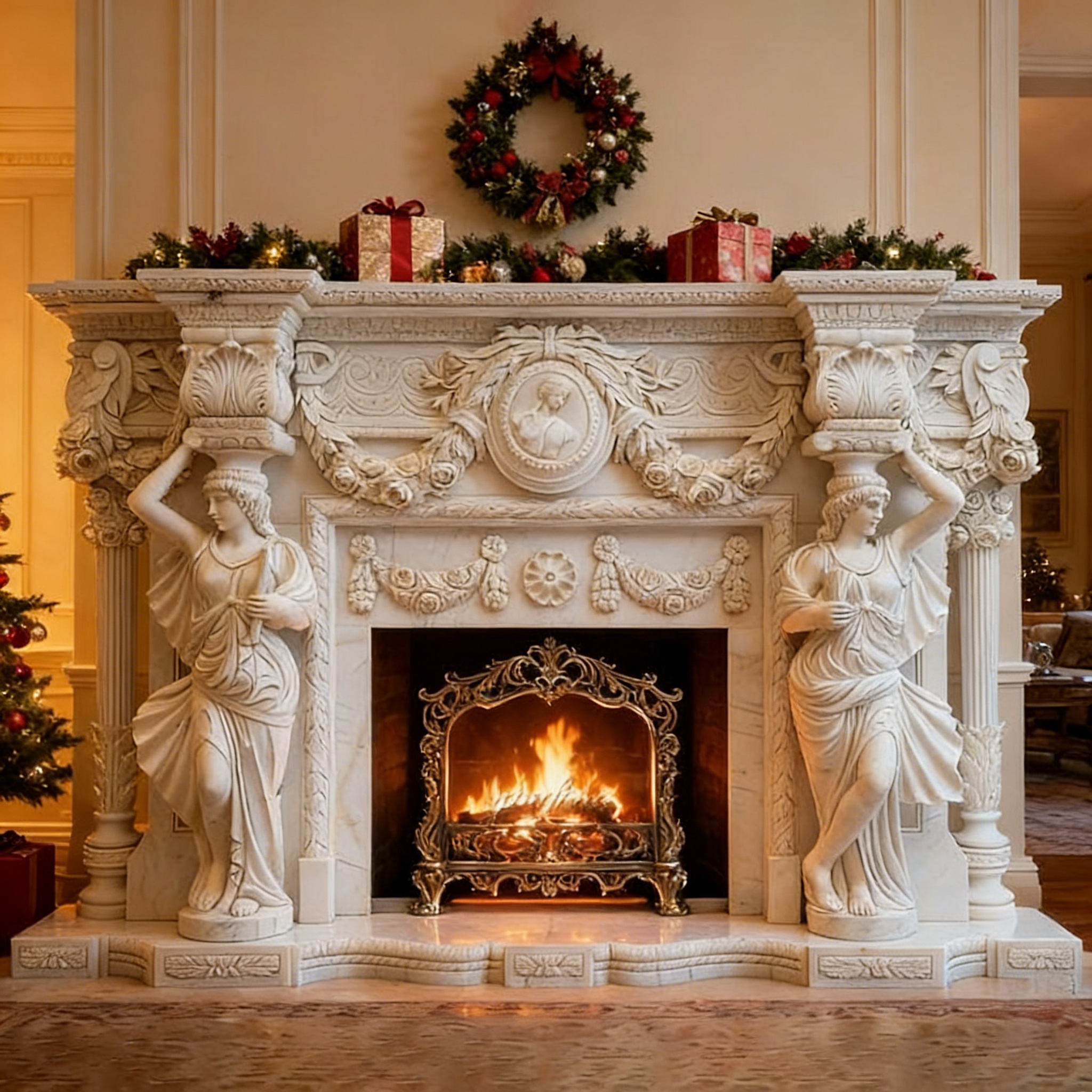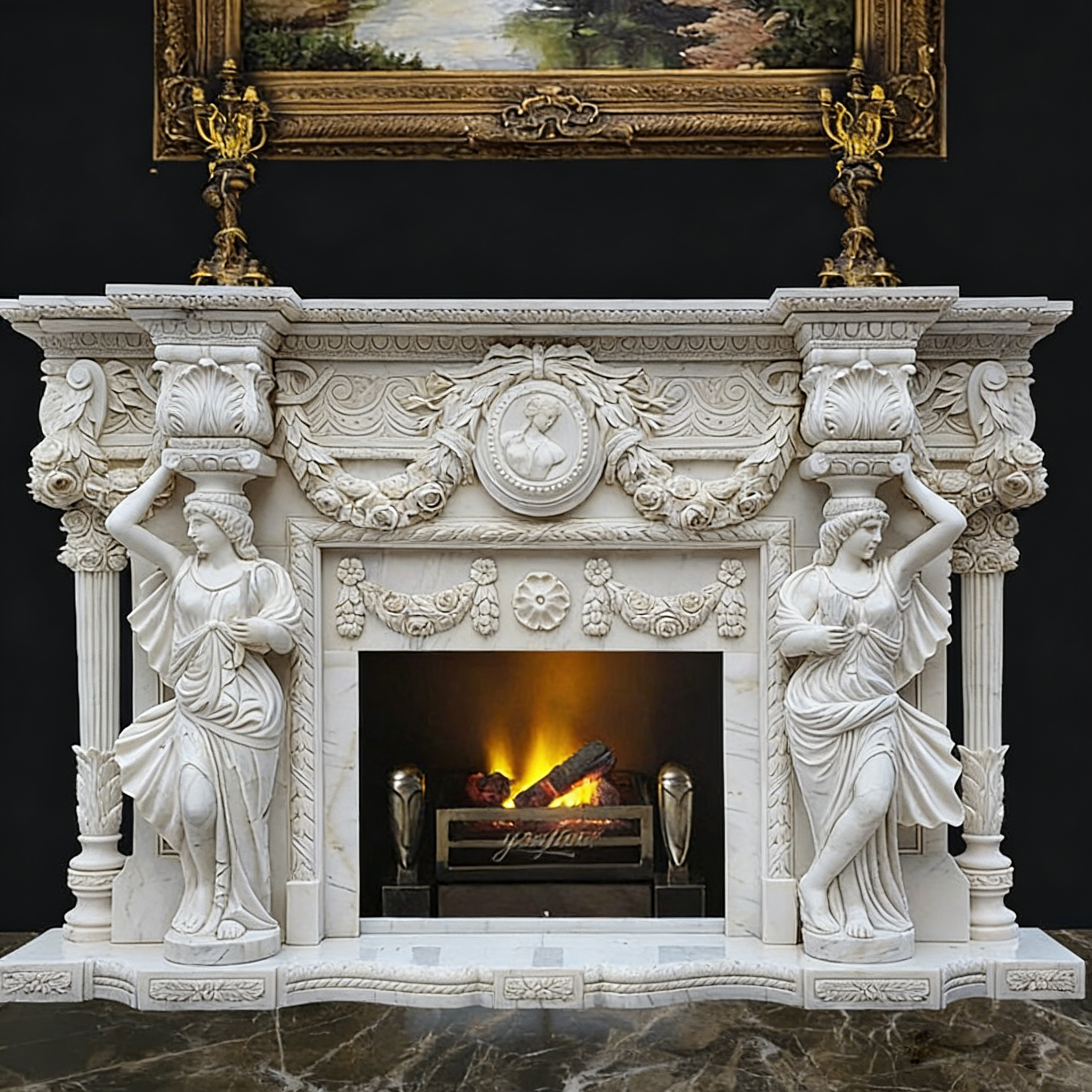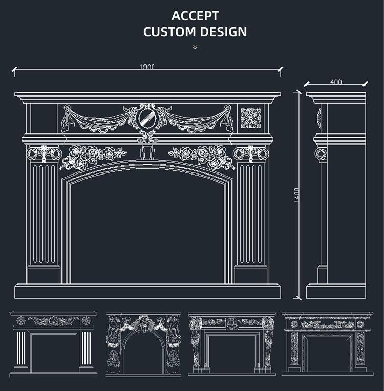 این یک شومینهٔ بسیار ظریف است که با دقت بالا از مرمر طبیعی باکیفیت بالا حکاکیشده و ترکیبی هنرمندانه از عناصر طراحی کلاسیک اروپایی ماندگار و نئوکلاسیک فرانسه — از جمله گارلندهای گلدار پیچیده، رلیفهای اسکرولشکل و مجسمههای کاریاتید سهبعدی — را بهگونهای خیرهکننده ترکیب کرده تا نقطهٔ کانونی چشمنوازی برای هر فضای داخلی مجللی ایجاد کند.