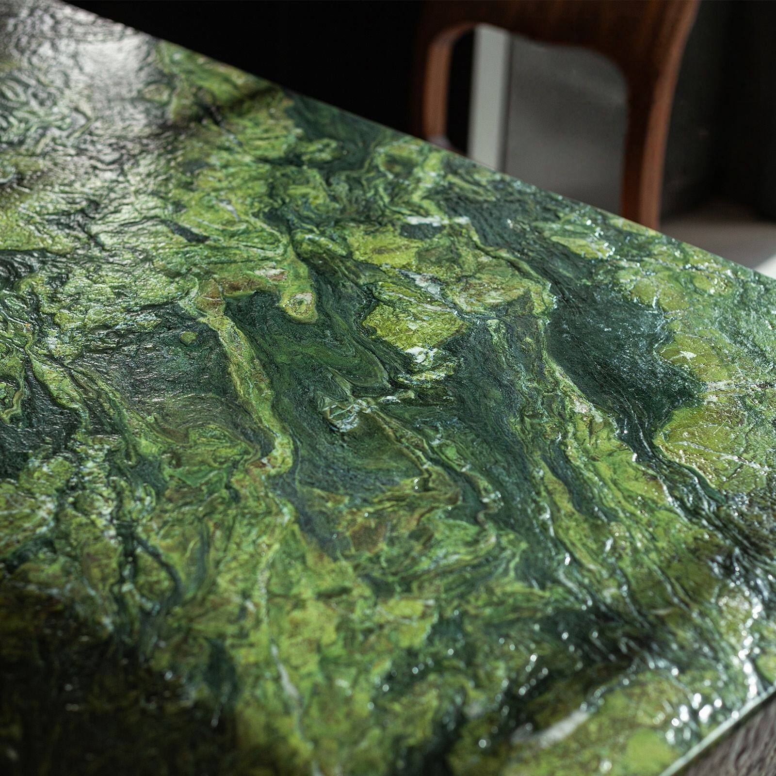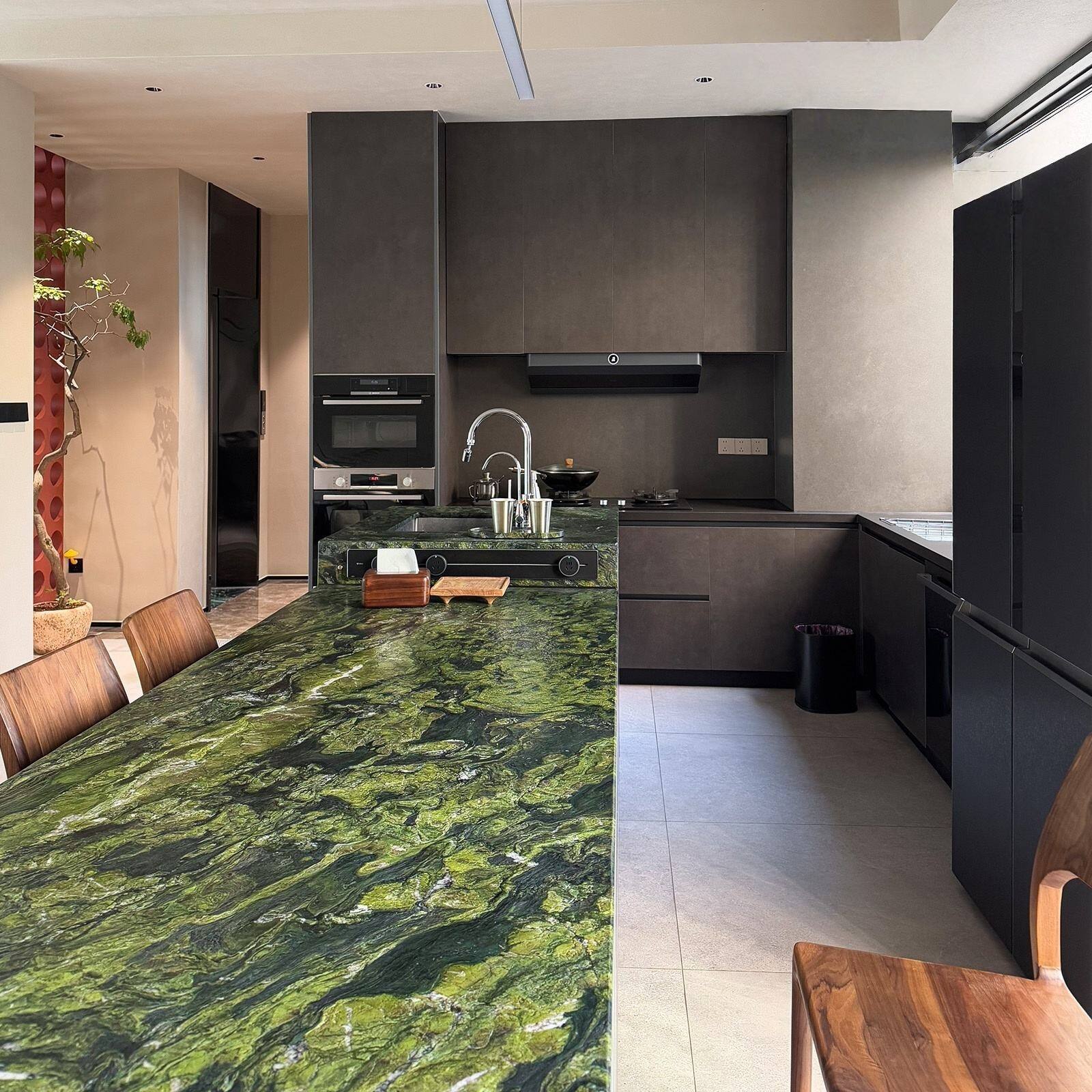 این جزیره آشپزخانه سبز تیره از مرمر جزیره آشپزخانه یک مادهٔ اولیهٔ لوکس است که برای طیف گستردهای از کاربردهای دکوراسیون داخلی در پروژههای ساختوساز مناسب میباشد. این ماده انتخابی عالی برای فضاهای داخلی است و بهویژه برای آشپزخانههای مسکونی لوکس، خانههای سفارشی مجلل و پروژههای بازسازی آشپزخانه با سطح بالا مناسب است. الگوی طبیعی چشمگیر و پرداخت ظریف آن نیز آن را به انتخابی ایدهآل برای جزیرههای آشپزخانهٔ برجسته، سطوح شستوشو و روکشها در اتاقهای اُتلهای بوتیک، نمونهخانههای نمایشی باکیفیت و فضاهای تجاری با سطح بالا تبدیل میکند و ارزش ماندگار و جذابیت ظریفی را به هر طراحی لوکس اضافه مینماید.