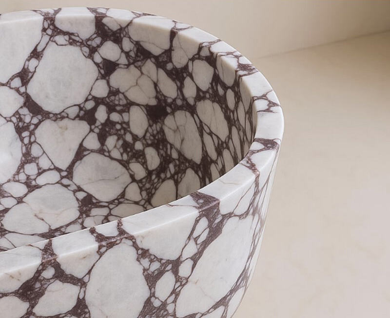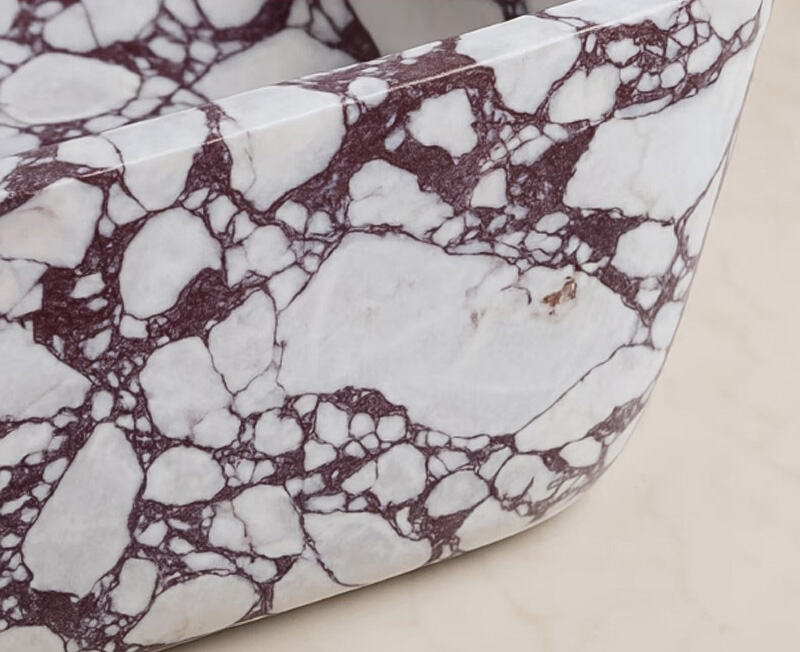 این وان حمام مستقل با دقت بالا از مرمر کالاکاتا با کیفیت بالا ساخته شده است. پایه سفید خالص آن بهصورت چشمگیری در تضاد با الگوهای بنفش و بنفشِ نرم و جاری قرار دارد و هر قطعه را به یک اثر هنری طبیعی منحصربهفرد تبدیل میکند. سطح آن با پرداخت براق بالا تکمیل شده است که آن را محکم، بادوام و دارای خواص عالی در حفظ حرارت میسازد و تجربهای مطبوع و طولانیمدت از حمامگرفتن فراهم میکند.