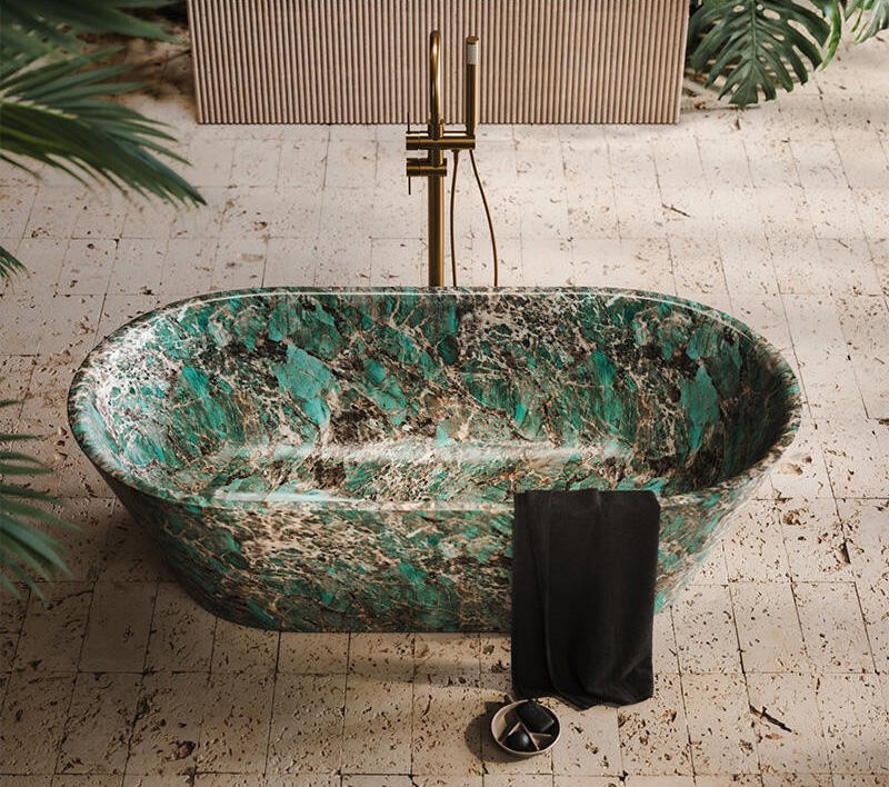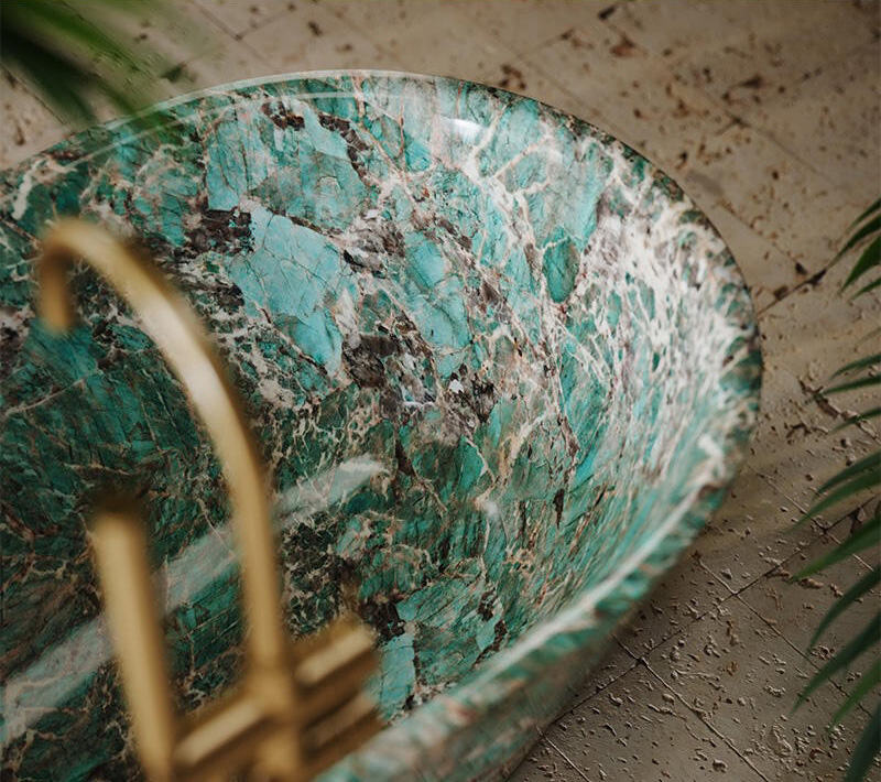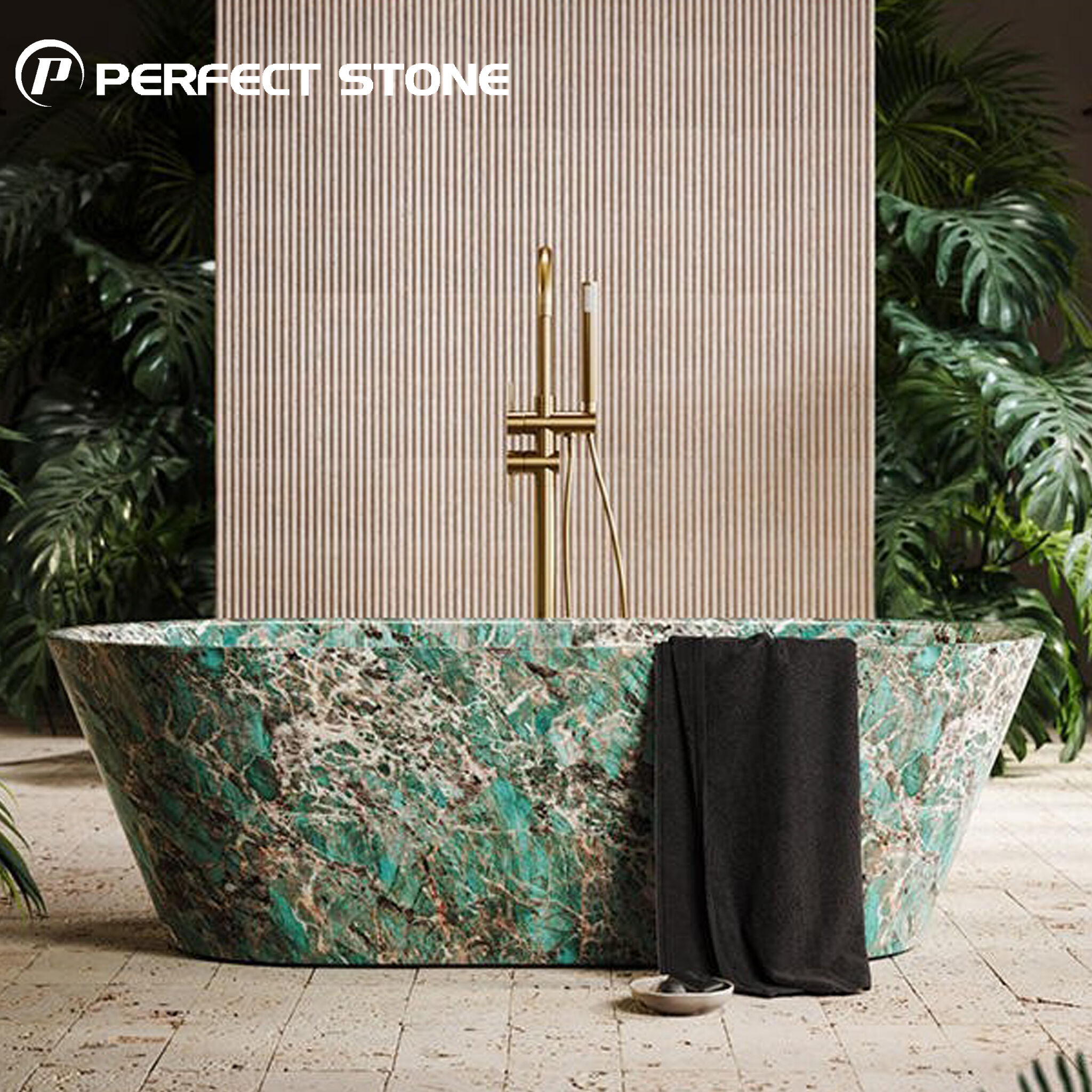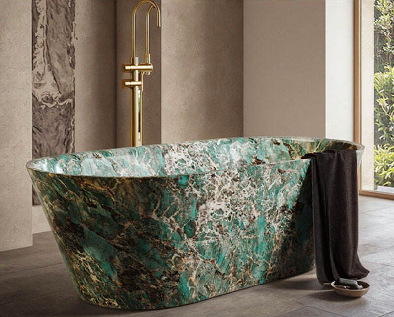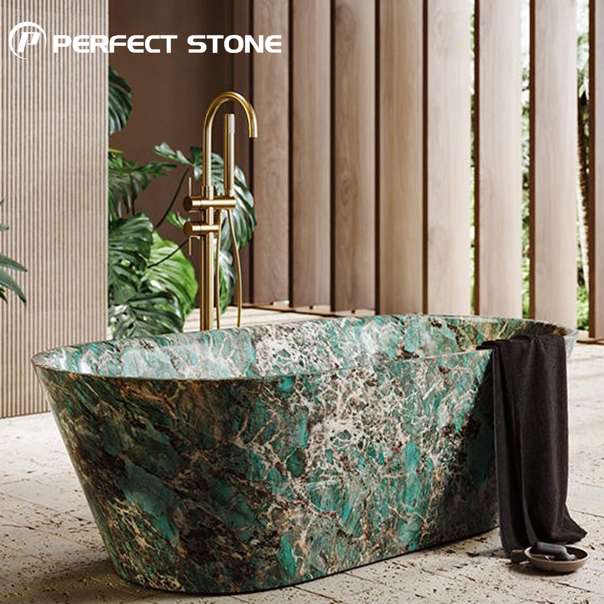 وان حمام سنگ کوارتزیت سبز آمازونیت از آمازون — این وان حمام از کوارتزیت طبیعی نادر ساخته شده و رنگ سبز جذاب آمازونیت و بافت معدنی منحصربهفردی دارد. این وان حمام دستساز، ترکیبی از لوکسبودن، دوام و ظرافت هنری است. سطح محکم و ضدآب آن در برابر لکهها، خراشها و دماهای بالا مقاومت میکند و زیبایی بلندمدت و نگهداری آسانی را تضمین مینماید. این محصول برای حمامهای لوکس، اسپاها و پروژههای مسکونی فاخر ایدهآل است و تجربهی عادی حمامگرفتن را به تجربهای باکیفیت و شبیه به تعطیلات تبدیل میکند، در عین حال جذابیت طراحی داخلی را با جذابیت طبیعی بیزمان تقویت مینماید.
