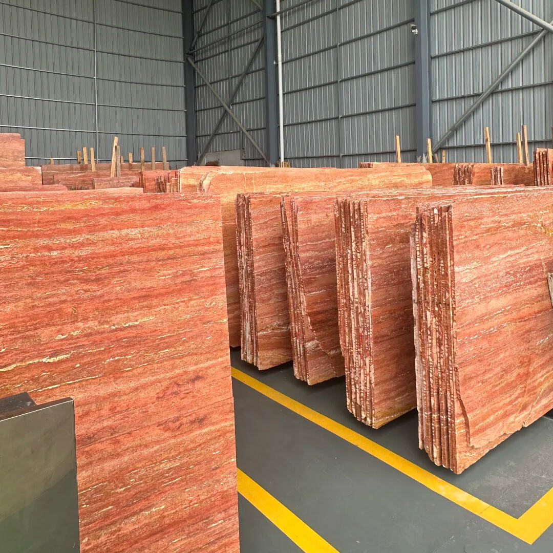 Rode travertijn heeft aanzienlijke voordelen. Ten eerste biedt het een unieke esthetische aantrekkingskracht. Het kenmerkt zich door levendige rode, roestkleurige en wijnkleurige tinten, en de natuurlijke kleurvariaties zorgen ervoor dat elke steenplaat onderscheidend is, waardoor elke installatie een uniek kunstwerk wordt. Dit opvallende visuele effect is ongeëvenaard door welk ander kunstmatig materiaal dan ook.