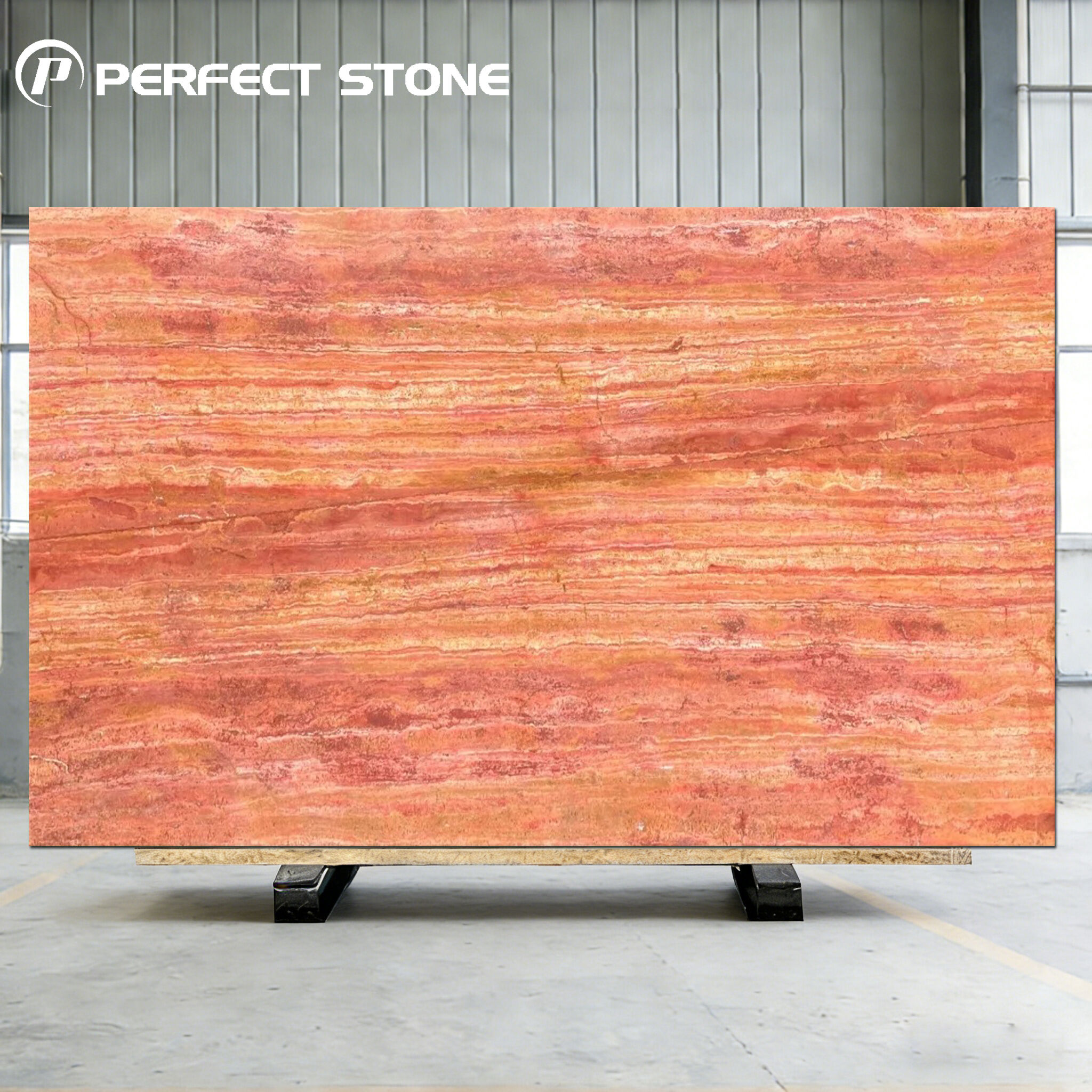 Rood travertijn is een zeer aantrekkelijke natuursteen. Het is een vorm van kalksteen die neerslaat uit mineraalrijk water en staat bekend om zijn rijke aardse tinten en terracotta-kleuren. Deze levendige kleuren zijn voornamelijk het gevolg van de aanwezigheid van ijzeroxiden en andere minerale onzuiverheden tijdens het vormingsproces. Het heeft een van nature poreuze structuur en vertoont doorgaans karakteristieke strepen, spiraalvormige patronen en onregelmatige holtes, die inherent zijn aan het snelle afzettingsproces.