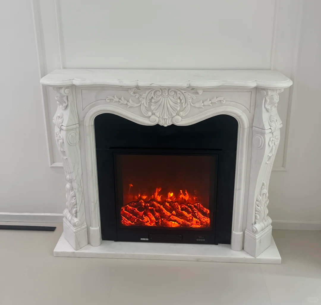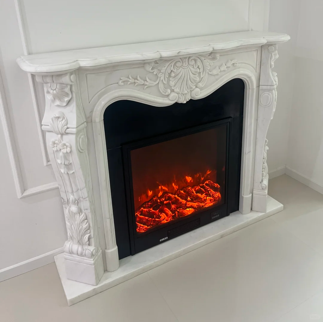 This French-style engraved marble fireplace is made from natural white marble and is crafted through traditional hand-carving techniques. It is a high-end home art piece that combines French romance, classical aesthetics, and practicality.