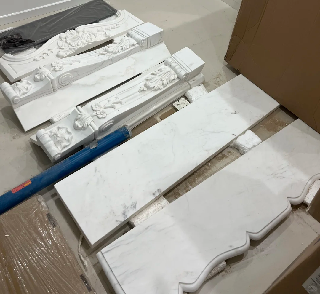 Craftsmanship and Design: Designed in the French Rococo style, the lintel is engraved with shell patterns, scroll patterns, and floral reliefs, while the columns are decorated with leaf patterns and swirl patterns. The lines are delicate and three-dimensional, with clear layers. The overall structure is symmetrical, the edges are rounded off, and the surface is finely polished and polished, giving a warm and jade-like touch, combining beauty with safety.