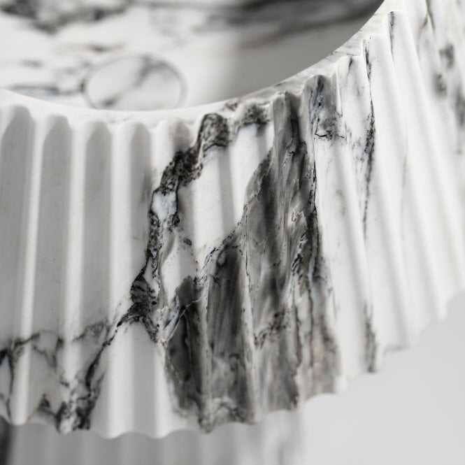 Crafted from premium Arabescato marble with striking natural veining, this fluted freestanding sink combines sculptural vertical texture with timeless luxury, serving as a sophisticated statement piece for high-end villa bathrooms and upscale hotel projects.