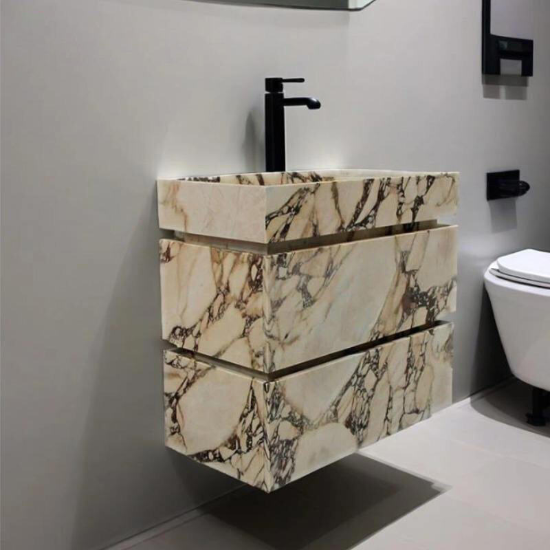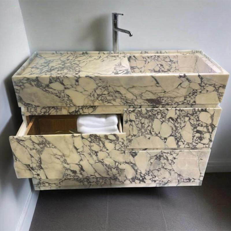 This floating Calacatta Viola marble vanity is a showstopper, defined by the stone’s warm ivory canvas and vivid, natural purple and grey veining—no two pieces are ever the same, giving your bathroom an exclusive, high-end touch. The wall-mounted, drawer-integrated design keeps the floor clear for an open, modern feel, while the durable, moisture-resistant marble surface promises lasting beauty with minimal upkeep. It’s the perfect blend of bold natural stone artistry and streamlined contemporary function, made for luxury bathroom spaces.