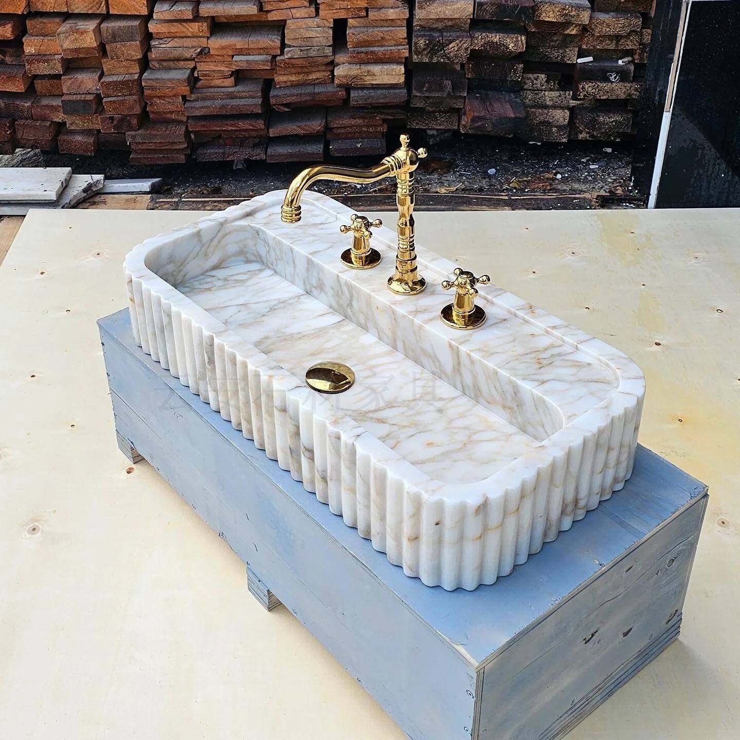 This fluted wall-mounted marble sink is crafted exclusively for luxury villa and hotel projects. Carved from premium natural marble, each piece boasts one-of-a-kind veining and texture, making every sink a unique work of art. The elegant fluted detailing along the sides adds depth and a refined, tactile charm, while the classic gold-finish faucet complements the stone’s natural warmth. Its wall-mounted design frees up floor space and simplifies cleaning, creating a sleek, clutter-free aesthetic. Perfect for elevating upscale bathrooms, it blends timeless beauty with durable functionality to suit discerning design projects.