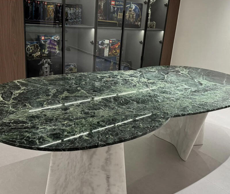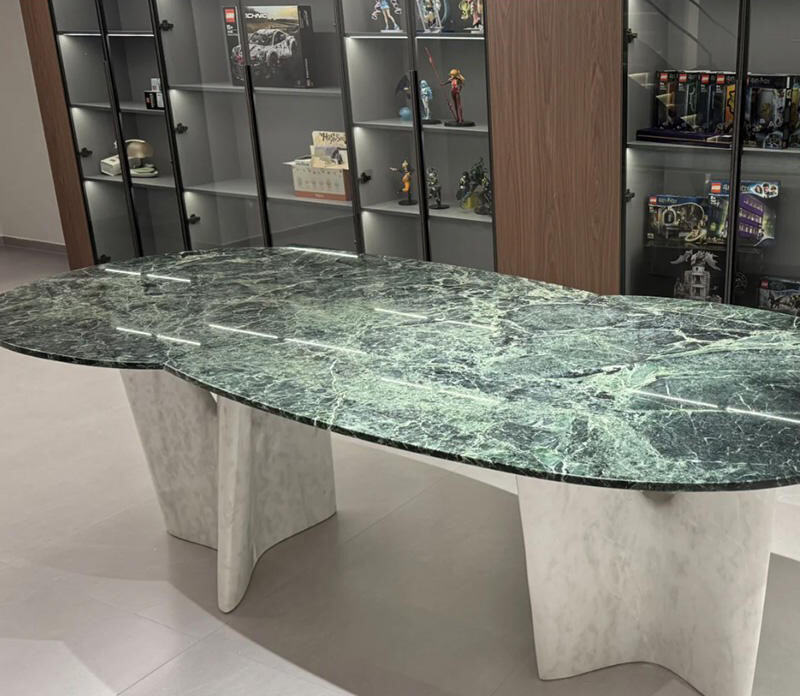 This dining table ingeniously combines the vibrant green marble tabletop with the pure and elegant white marble legs, as if a lush oasis, soaked in morning dew, grows on the clouds. The green tabletop has a naturally flowing texture, resembling mountain ridges or water ripples, and each piece is a unique work of art; the white legs bring a visual sense of lightness, balancing the heaviness of the stone and making the overall design more elegant and modern.