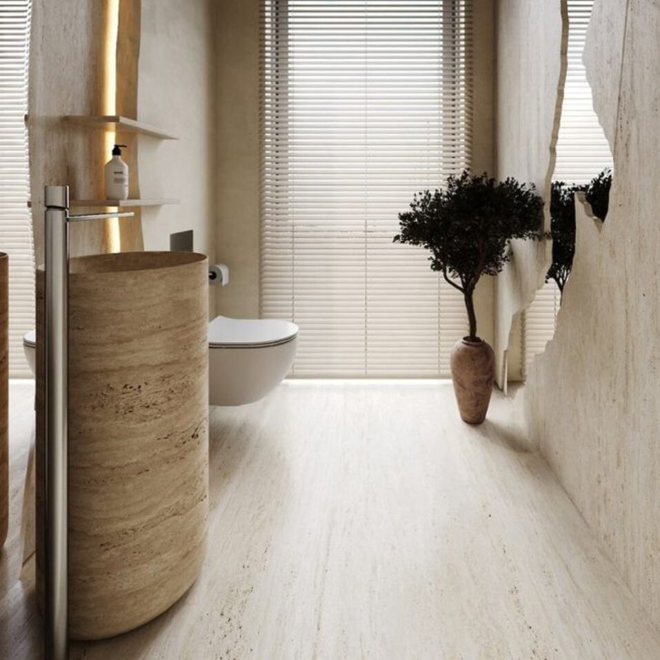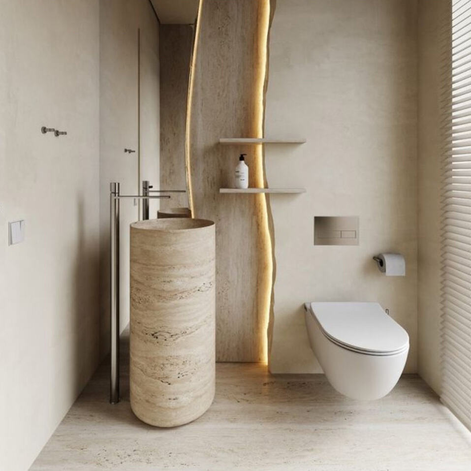 Modern Beige Travertine Stone Freestanding Sink for Luxury Villa Hotel Bathroom, crafted from premium natural travertine with its signature porous texture and warm, earthy tone, this statement pedestal sink combines sculptural minimalist design with functional bathroom luxury, bringing timeless organic elegance to high-end residential and hospitality bathroom projects.