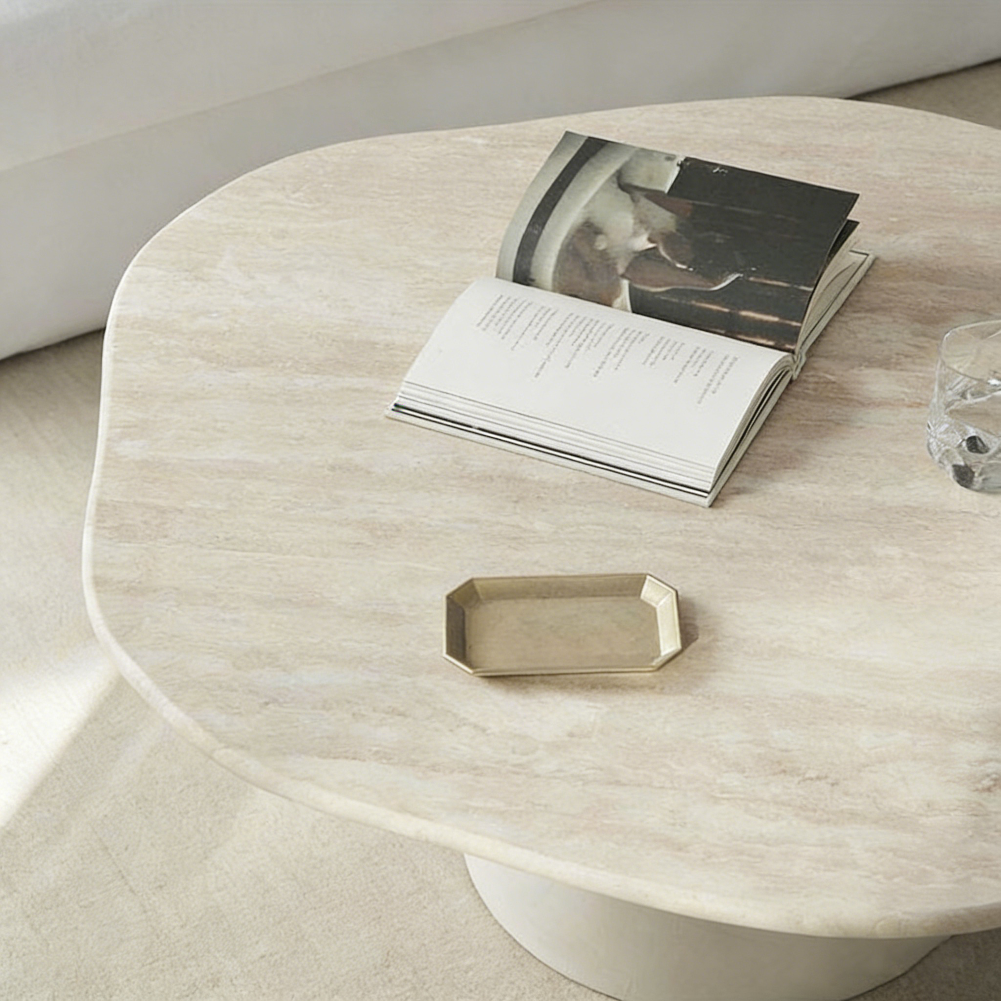 This travertine coffee table is meticulously crafted from high-quality natural travertine. Its notable features include a warm earthy color, fine porous texture, and soft natural patterns. Each piece bears a unique natural mark, exuding a rustic and Mediterranean charm. It features a thick, sturdy stone structure with excellent stability and load-bearing capacity, making it durable and suitable for long-term daily use. The surface has been finely treated, providing a smooth touch, is stain-resistant, and easy to maintain. Its design is simple and fashionable, integrating natural beauty with practical functionality, making it suitable for decoration in high-end residences, villas, hotels, and various upscale interior spaces.