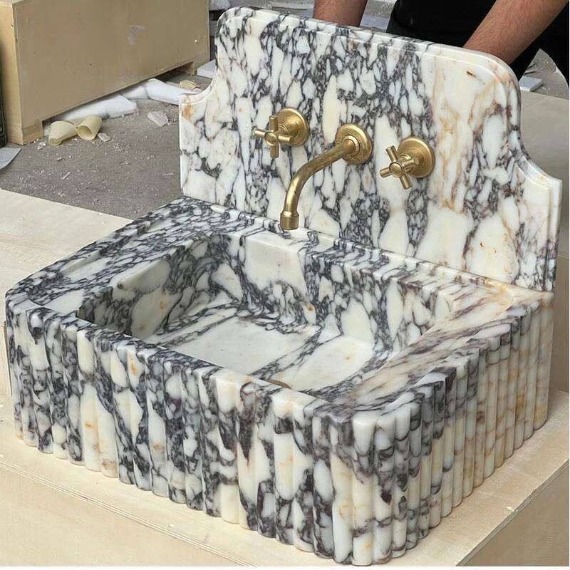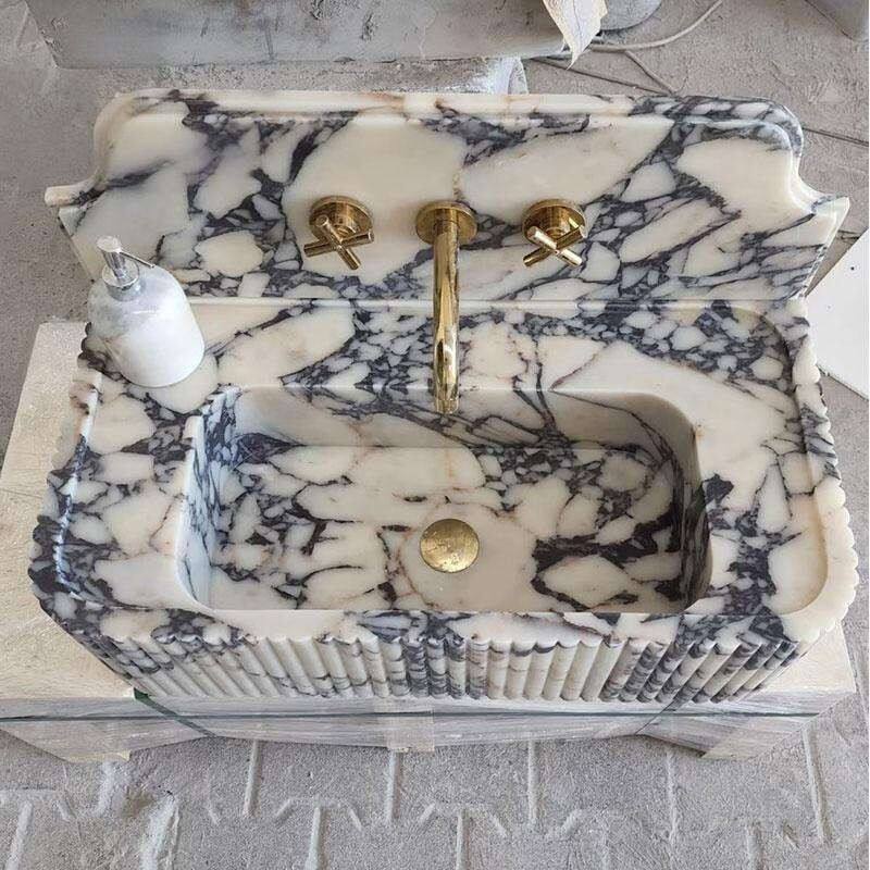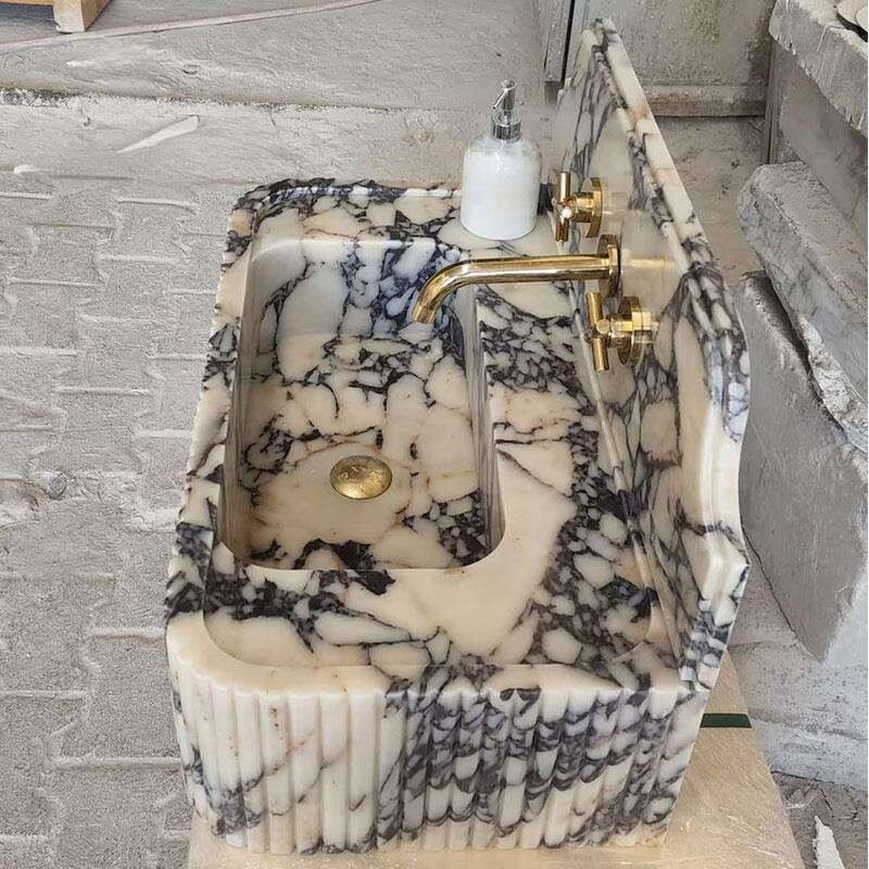 This wall-mounted Calacatta Viola marble sink vanity is intended for use in bathrooms, powder rooms, and en-suite spaces. It is commonly specified for luxury villa bathrooms, boutique hotel guest rooms, upscale restaurant restrooms, and high-end residential construction projects. Its wall-mounted design is suitable for compact or modern layouts, providing both a functional washing area and a decorative feature in high-end interior design schemes.